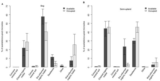 Charred organic was the most common seedbed available in semi-upland habitats at 44%, followed by dead wood at 30% and dry unburned organic matter at 23%, convex mineral soil, concave mineral soil, wet unburned organic matter, and other seedbeds made up <5% of available seedbeds (Figure 4B). Of the 1457 seedlings observed, 48% established on dead wood, 45% on charred organic matter, 4% on wet unburned organic matter, 2% on dry unburned organic matter, and <1% on convex and concave mineral soil combined (Figure 4B). Black spruce seedlings tended to prefer charred organic matter as a seedbed in both habitats (p = 0.021). In bogs, wet unburned organic matter was also a preferred seedbed, while dry unburned organic matter was preferred only slightly. In semi-uplands, dead wood and wet unburned organic matter were other preferred seedbeds. Preference values for all other substrates were low.