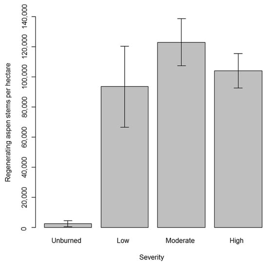 Aspen regeneration (stems per hectare) across the three fire severities (low, moderate, and high) and in unburned stands. Values are mean and standard error.