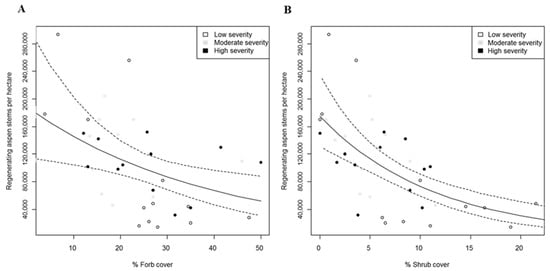 For burned stands, forb and shrub cover negatively affected regeneration of aspen (βforb = −0.017, pforb = 0.036, βshrub = −0.076, pshrub < 0.001, pseudo R2 = 0.475). Specifically, a 10% increase in either forb or shrub cover decreased aspen regeneration by approximately 20,000 stems/ha (Figure 6).