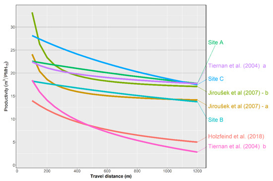 - Holzfeind, T.; Stampfer, K.; Holzleitner, F. Productivity, setup time and costs of a winch-assisted forwarder. J. For. Res. 2018, 23, 196–203. [Google Scholar] [CrossRef]