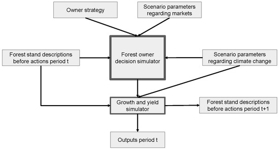 The data and models that were involved in simulating the actions taken on one property in one period are depicted in Figure 1. The forest owner decision simulator operated on three general categories of input parameters; the state of the stands of the property, the strategy followed by the forest owner, and the scenario in terms of prices, demanded volumes, and assumed climate change. Once decisions on silvicultural treatments were derived for the stands, the decisions entered the growth and yield simulator. Together with scenario assumptions regarding climate change, the growth and yield simulator projected the state of each stand into the next period. Current period outputs in terms of harvest volumes and costs were also produced as a result of the simulation of treatments on the stands. Section 2.2 together with the supplementary material describes the forest data, Section 2.3.3 gives details on owner strategies, and Section 2.4 describes the climate change mitigation scenarios.