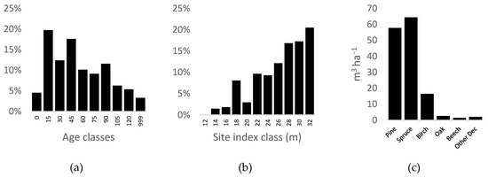 The initial state for forest variables for the 10 areas representing Kronoberg County with respect to (a) age class distribution, (b) site index H100 in 2 m classes, and (c) species distribution.