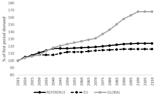 The REFERENCE scenario (see [53]) takes into account the EU climate policies and targets until 2020 that were in place in 2016, thereafter continuing according to historical development without any further policy intervention. The global temperature is assumed to be about 3.7 °C higher by 2100 than the pre-industrial level.