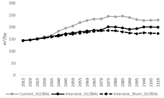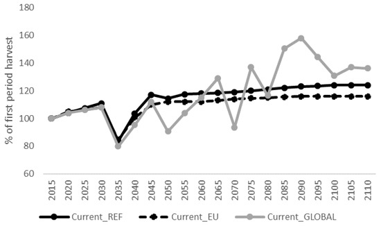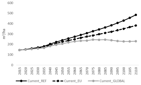 As a consequence, the standing volume on all productive forestland (i.e., including set-asides and retention areas) increases markedly in Current_EU (to 383 m3ha−1 in 2110) and Current_REF (to 485 m3ha−1) during the projected period (Figure 6), while the increase, although substantial, is lower in Current_GLOBAL (to 230 m3ha−1).