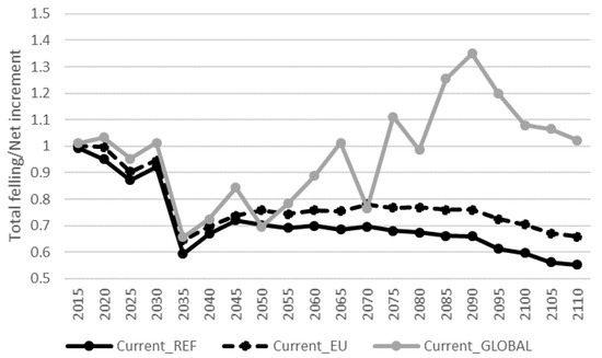 The utilization rate, i.e., total felling including PCT through net increment (i.e., after subtracting the mortality), is close to 1 on the net area used for wood production in the beginning of all projections (Figure 5). During periods of wood shortage (e.g., 2035 and 2040 in all projections), the utilization rates drop due to the lower harvests. The warmer climate in REFERENCE and EU BIOENERGY results in higher growth rates compared with GLOBAL BIOENERGY and the projected increases in demand in these two scenarios are also more modest (see Section 2.4). As a result, the utilization rates are generally lower in Current_REF and Current_EU compared to Current_GLOBAL and the difference increase with time (Figure 5). In periods during the end of the projection where the demand is satisfied in Current_GLOBAL (e.g., during 2085 and 2090), the total felling is substantially higher than the net increment. This finding indicates that the scenario demand is higher than what can be sustained with current management practices.