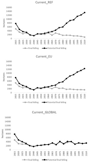 An excess of potential final felling areas during the first four periods are followed by wood shortages (2035 and 2040) in all projections, where all potential final felling areas are harvested (Figure 7). In Current_REF and Current_EU, this is followed by two periods where potential final felling areas are slightly lacking (Current_REF in 2050), or just sufficient to meet scenario demand. Towards the end of the projections, there are large buildups of areas available for final felling due to the lower utilization rates. In Current_Global, there is no such buildup, and from 2035 onwards, the stands are generally final felled as soon as they become available for harvest.