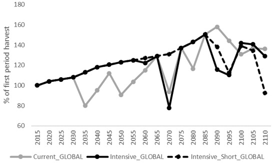 Projected harvests (expressed as percentage of first period harvest) of roundwood (sawlogs and pulpwood from thinning and final felling) with current management approaches of different intensities in the GLOBAL BIOENERGY scenario.