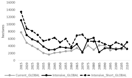 Projected potential areas available for final felling (in hectares) with current management approaches of different intensities in the GLOBAL BIOENERGY scenario.
