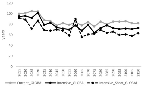 Projected average rotations (i.e., age at final felling) with current forest management approaches of different intensities in the GLOBAL BIOENERGY scenario.
