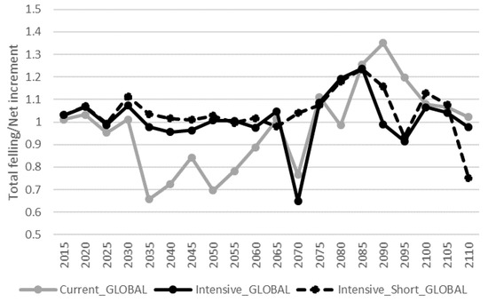 The higher felling in Intensive_GLOBAL and Intensive_Short_GLOBAL during 2035–2060 results in higher utilization rates (where the net increment and total felling are approx. equal) on the net area used for wood production compared to Current_GLOBAL (Figure 11). Towards the end of the projection period, the utilization rates are highly fluctuating in all projections, reflecting the difficulties of meeting the scenario demand with current management approaches.