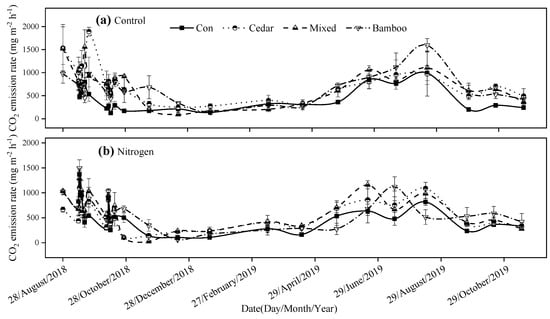 Soil CO2 emission dynamics as affected by N deposition (a, Control; b, N deposition) and different fine root litter treatments over 14-month in situ study. Con, no root litter; Cedar, cedar fine root litter; Bamboo, bamboo fine root litter; Mixed, mixed fine root litter by both Cedar and Bamboo at 1:1 ratio.