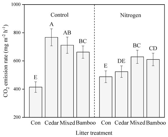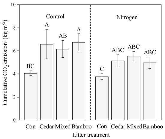 Cumulative soil CO2 emissions (kg m−2), as affected by nitrogen (control vs. nitrogen) and fine root litter (con, cedar, bamboo, or mixed litter by cedar and bamboo fine root) treatments.