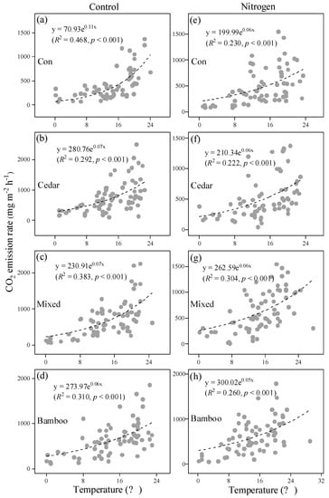 Correlations between soil CO2 emission rate (mg m−2 h−1) and soil temperature (°C) with different nitrogen (control vs. nitrogen) and fine root litter (con, a and e; cedar fine root, b and f; mixed fine root litter, c and g; bamboo fine root, d and h) treatments. Goodness of fit of the data to the single positive exponential model (R2) and p values are shown.