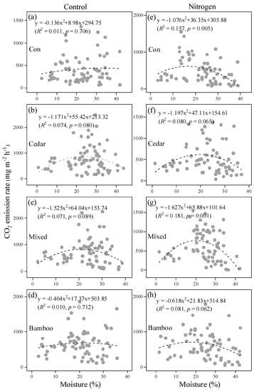 Correlations between soil CO2 emission rate (mg m−2 h−1) and soil moisture (%) with different nitrogen (control vs. nitrogen) and fine root litter (con, a and e; cedar fine root, b and f; mixed fine root litter, c and g; bamboo fine root, d and h) treatments Goodness of fit of the data to the quadratic equation (R2) and p values are shown.