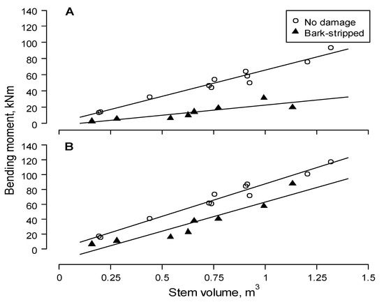 Bending moment of the Norway spruce stem at the primary failure (A) and secondary failure (B) according to stem–wood volume and presence of bark-stripping wound.
