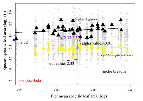 For example, we illustrate the trait gradient analysis for specific leaf area (log) of species in a subtropical evergreen deciduous broadleaved mixed forest in Figure 1. We chose two dominant evergreen (Cyclobalanopsis multinervis, Fagaceae) and deciduous species (Carpinus fargesiana, Betulaceae) highlighted for illustration. First, we calculated the mean trait value for each plot, considering all species in the plot. Then the plots were arranged along a gradient according to their trait means, forming the x-axis of Figure 1 (the‘trait-gradient’). Each species has a point-location for each plot it was found in Figure 1. The x-value is the plot mean for the trait (beta values), and the y-value is the trait value for the individual species (ti). Beta components are the x-axis means for each species, as depicted with larger symbols (yellow circles for evergreen species: Cyclobalanopsis multinervis). Beta components describe the habitats where each species occurs, relative to the mean trait value across all species at those sites. The niche breadth of a species is then characterized as the range of plots occupied. Alpha components measure the deviation of species trait values from the cross-species mean at each site, that is, the deviation in the y dimension from the Y = X line in Figure 1. Alpha components reflect the trait differentiation of each species relative to co-occurring taxa [18].