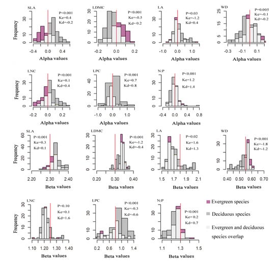 The distribution of frequency of alpha and beta values for evergreen and deciduous species’ seven functional traits. Note that: The abscissa was alpha values or beta values, and the ordinate was the frequency of alpha or beta values. P indicates whether the correlation is significant (p < 0.05; p < 0.01; p < 0.001. Significant correlation). Ke indicates the degree of skewness of evergreen species. Kd indicates the degree of skewness of deciduous species. K < 0 , the distribution skews to the right of the average. K > 0, the distribution skews to the left of the average.