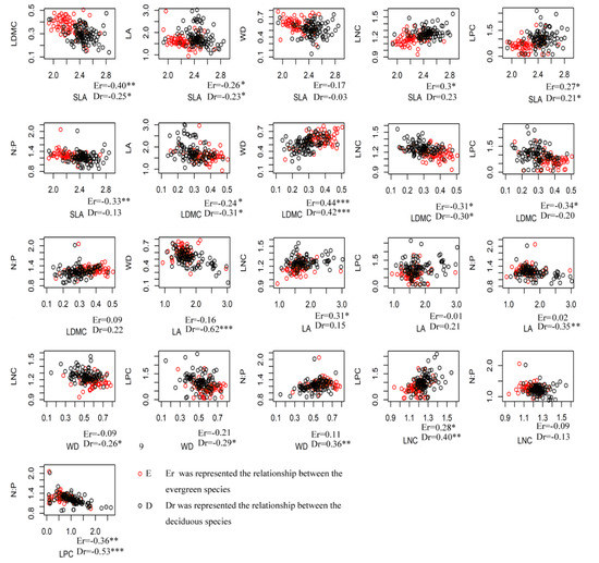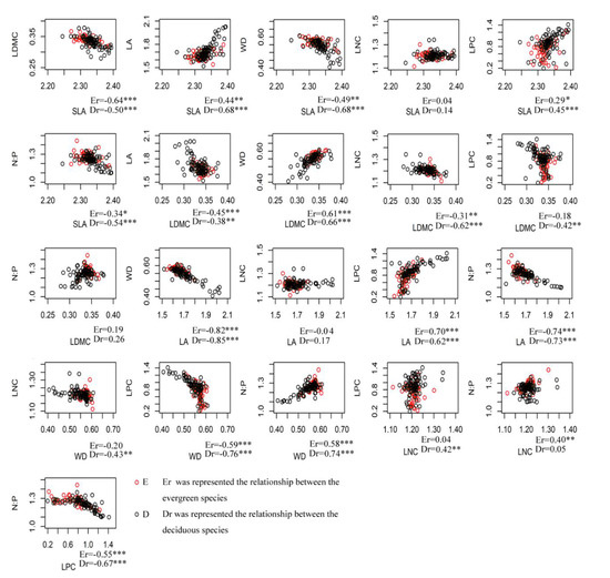 Scatterplots of species’ alpha trait values for all pairwise combinations of evergreen and deciduous species for the seven functional traits in a broadleaved mixed forest in Central China. (* p < 0.05; ** p < 0.01; *** p < 0.001).