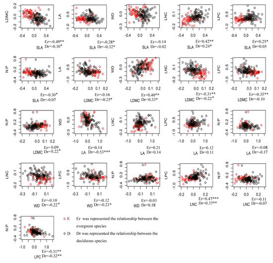Scatterplots of species’ beta trait values for all pairwise combinations of evergreen and deciduous species for seven functional traits in a subtropical evergreen deciduous broadleaved mixed forest in Central China. (* p < 0.05; ** p < 0.01; *** p < 0.001).