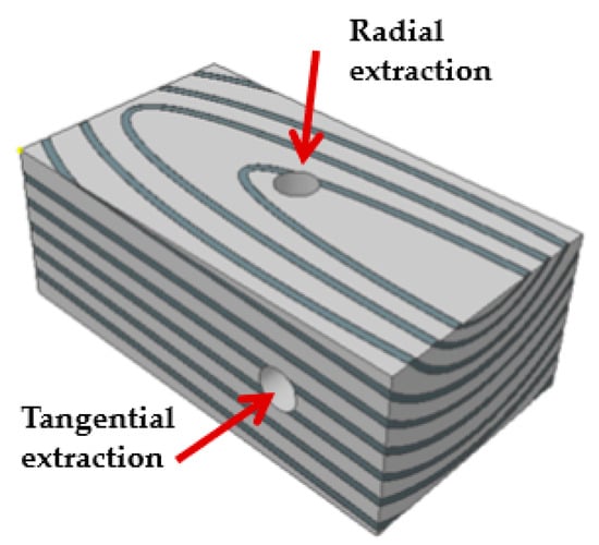 Two tests per specimen were performed following the methodology described in Martínez et al. [51], one in radial direction and another in tangential direction. The location of the tests is shown in Figure 2. Each extraction was weighed with a resolution of 0.01 g, and the diameter and depth of each hole were measured with a resolution of 0.01 mm. For each sample, the density of the wood extracted in each of the holes was calculated according to Equation (1), using the nominal volume of the hole and the mass of the chips removed, discounting the mass of the filter.