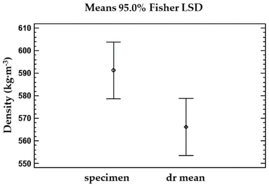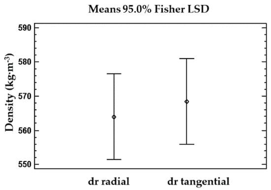 Normality was verified for each variable. No significant differences between radial and tangential drilling residue densities at 95% confidence level (ANOVA p value = 0.9245) were found (Figure 3). Martínez et al. (2018) declared similar findings in the case of pine species. CDT, pullout resistance and needle penetration resistance measurements also showed no differences [29,46,52,53].