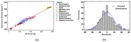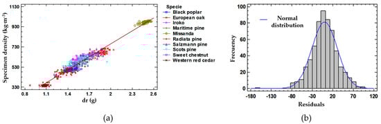 Linear regression between specimen density and drill residue mass mean of radial and tangential results. (a) Plot of the fitted model; (b) Frequency histogram of the model residuals.