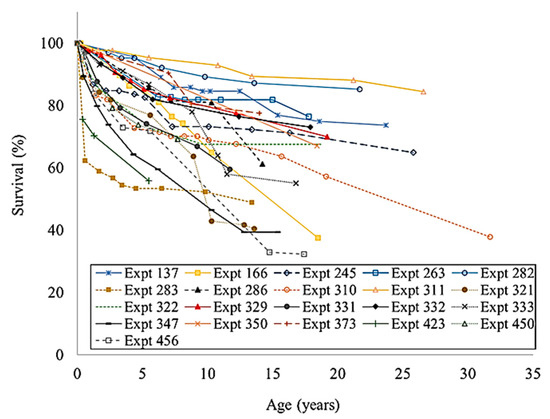 For Flindersia brayleyana particularly, the continuing decrease in survival over time—across all experiments—indicates a fundamental inadequacy in growing conditions. This study showed that, compared to the other species, Flindersia brayleyana has adapted best to the enrichment planting environment. Although this species is described as a late secondary successional species [32], in rainforest, it can persist for many decades in the deep shade as suppressed seedlings [33]. Its growth is consequently slow until a suitable light gap occurs, after which it develops quickly [34]. The low annualised mortality (Appendix A Table A3) of the best performing experiment of this species (experiment 282) supports this finding. Where these conditions do not apply, mortality may become severe, even at later ages (e.g., Cardwellia sublimis in experiment 226).