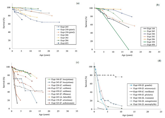 The survival of Agathis robusta (a); Araucaria cunninghamii (b); Cardwellia sublimis, Araucaria bidwillii, Swietenia macrophylla, Flindersia bourjotiana, Flindersia schottiana, Flindersia ifflaiana, and Flindersia amboinensis (c); Khaya ivorensis, Khaya senegalensis, Eucalyptus grandis, Eucalyptus microcorys, Corymbia torelliana, and Eucalyptus pilularis (d) in enrichment planting experiments in north Queensland. Plot 1 of experiment 250 was planted with the southern provenance of Agathis robusta.