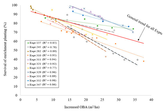 To identify the effect of overwood growth on the survival of enrichment plantings, linear regression was used to identify the relationship between the dependent variables (i.e., survival of enrichment plantings) and independent variables (i.e., overwood basal area).