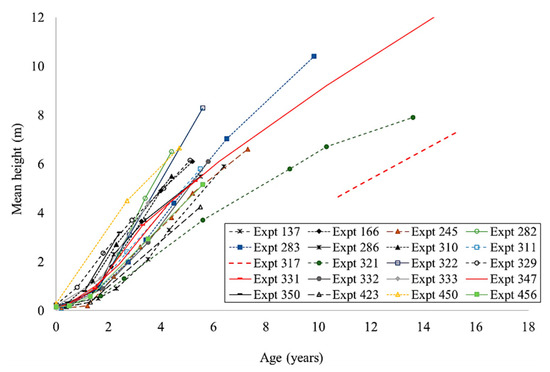 The height growth of enrichment plantings in all experiments was slow and showed substantial differences between species and sites (Figure 4 and Figure 5). Any comparison of the results was complicated by the varying ages at which measurements ceased and the limited dataset for some species. If the Flindersia brayleyana experiments are considered as a whole, the height growth trajectory of approximately 10 m at age 10 is clearly superior to all other species (Figure 4). By comparison, a lower height of approximately 6 m was recorded for Araucaria cunninghamii at the same age (Figure 5a). The southern provenance of Agathis robusta performed poorly in comparison to the northern provenance of this species (Figure 5b). Very poor height growth, that is, less than 3 m at 10 years of age, was recorded for Araucaria bidwillii, Flindersia amboinensis, Khaya senegalensis, and Swietenia macrophylla (Figure 5c,d). The early death of Eucalyptus grandis and Eucalyptus microcorys reduced the usefulness of the data (Figure 5d).