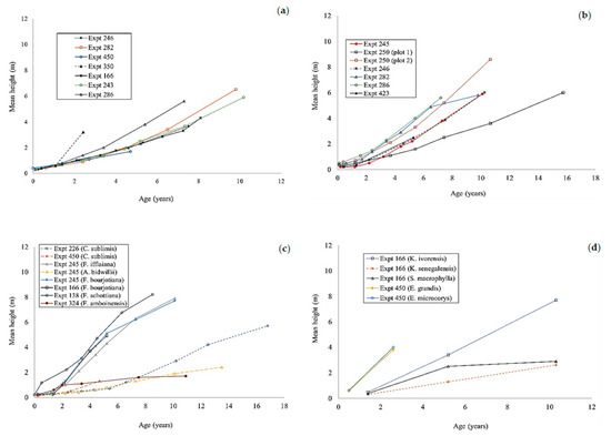 The height growth of Araucaria cunninghamii (a); Agathis robusta (b); Cardwellia sublimis, Araucaria bidwillii, Swietenia macrophylla, Flindersia bourjotiana, Flindersia schottiana, Flindersia ifflaiana, and Flindersia amboinensis (c); Khaya ivorensis, Khaya senegalensis, Eucalyptus grandis, and Eucalyptus microcorys (5d) in enrichment planting experiments in north Queensland. Plot 1 of experiment 250 was planted with the southern provenance of Agathis robusta.