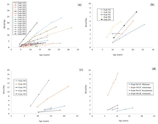 The growth of basal area of Flindersia brayleyana (a); Agathis robusta (b); Araucaria cunninghamii (c); Flindersia ifflaiana, Flindersia schottiana, Flindersia bourjotiana, and Khaya ivorensis (d) in enrichment planting experiments in north Queensland.