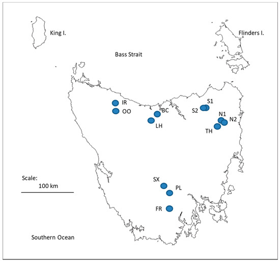 Location of P. radiata plantations in Tasmania at which the study was carried out (see Table 1 for latitude, longitude and other site information). BR = Branchs Creek; FR = Franklin; IR = Inglis River; LH = Longhill; N1 = Nicholas 1; N2 = Nicholas 2; OO = Oonah; PL = Plenty; S1 = Springfield 1; S2 = Springfield 2; SX = Styx; TH = Tower Hill.