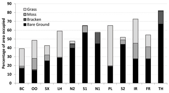 The stacked bar graph depicts four of the components of the vegetation. The total height of each bar corresponds to BBMG, the sum of the percentages of the area occupied by bare ground, bracken, moss and grass. The horizontal axis lists the 12 sites from left to right in order of increasing percentage girdling. BC = Branchs Creek, 0% girdling; OO = Oonah, 0.4%; SX = Styx, 1.3%; LH = Longhill, 2.5%; N2 = Nicholas 2, 4.7%; S1 = Springfield, 8.7%; N1 = Nicholas 1, 16.1%; PL = Plenty, 16.7%; S2 = Springfield 2, 21.8%; IR = Inglis River, 22.9%; FR = Franklin, 25.5%; TH = Tower Hill, 41.6%.