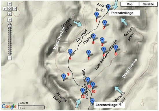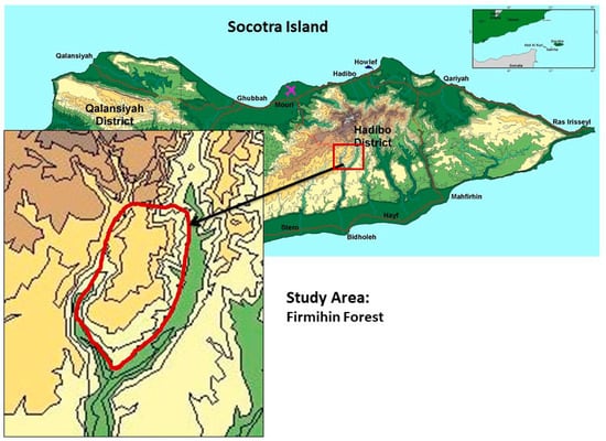 The local people are pastoralists, spending most of the winter and the summer rainy season in Firmihin along with their livestock and most of the summer dry season in the Haggeher Mountains. Some go farther east with their cows to the Momi area. They do not cultivate date palms, and they have very few home gardens. This locality was selected due to the occurrence of a relatively dense D. cinnabari forest distinguished by high canopy closure (over 30%) [39]. The area has very clear boundaries formed by deep surrounding wadis (Figure 1).