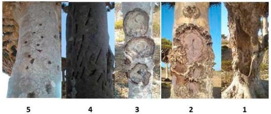 As presented in Figure 7, the analysis of variance (ANOVA; p-value < 0.05) was run, and the data were tested with the LSD test and visualized, which showed that Treatments 1, 2 and 3 belonged to the same group (all are marked as “a”), and Treatments 4 and 5 were another group, "ab". Therefore, according to the dependent variable (number of wounds), a significantly lower wound number was observed on trees with crown statuses 4 and 5 (which are logically the “best” trees), and a higher wound number was observed on trees with crown statuses 1, 2, and 3 (highly damaged). Therefore, the high numbers of wounds caused low vitality of the tree, and the low number of trees in with crown status 1 (highly damaged) additionally showed that the highly damaged trees were more likely to be removed by natural factors, such as the strong monsoon wind on Socotra.