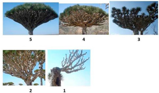 The Socotra Archipelago, which is located at the crossroads between the Red Sea, the Arabian Sea, and the Indian Ocean, is recognized as a regional center of biodiversity and was declared a UNESCO World Natural Heritage Site in 2008. The archipelago is rich in biodiversity, with spectacular endemic species; more than 37% of the plant species are endemic [7], including the dragon’s blood tree (D. cinnabari), but the area is also rich in traditions that have conserved this biodiversity until today [6]. D. cinnabari greatly contributes to the biodiversity value of the island [8]. This tree is the island’s flagship species [9], and the local Dracaena forest represents one of the Earth’s oldest forest ecosystems [10]. It was presumably present over larger areas of the island in the past [11,12,13,14]. This vegetation type is unique to Socotra, and as such, it is extremely important and has high global significance [15]. According to Attorre et al. [11], the Firmihin forest could be destroyed within 60 years due to the increasing aridity caused by global climate change forces. Habrová et al. [16], Hubálková [12], and Maděra et al. [9] showed a 40% decrease in population abundance after 100 years, taking into account only the internal force of aging (assuming little or no regeneration).