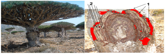- Adolt, R.; Pavlis, J. Age structure and growth of Dracaena cinnabari populations on Socotra. Trees 2004, 18, 43–53. [Google Scholar] [CrossRef]