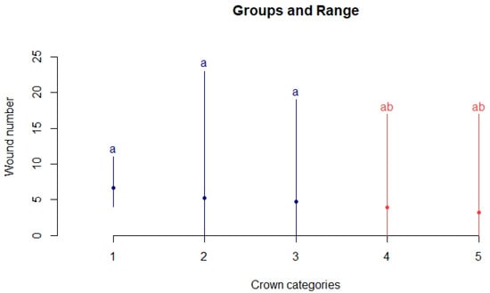 Correlation showing the relationship between the crown categories and wound number; two groups were identified: A and ab (p-value = 0.0004154).