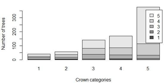 The contingency table (barplot) in Figure 8 shows that the frequency of trees with damaged crowns was positively associated with the frequency of trees with damaged trunks according to the chi-square test (p-value < 0.05), suggesting that due to harvesting (wounds), the trunk becomes damaged, and the whole tree becomes weak.