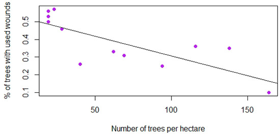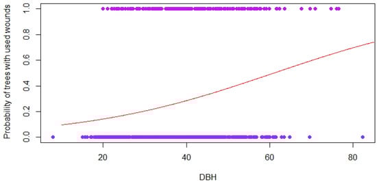 Correlation showing the relationship between diameter at breast height (DBH) and the probability of trees having used wounds (209 trees) out of the total wounded trees (667 trees; p-value = 1.34 × 10−6; field measurements).