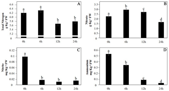 As shown in Figure 1, different forms of nitrogen have different expression trends under CO2 stress. Among them, there was no significant difference in the total nitrogen content in Masson pine needles after 6 h of treatment compared with 0 h of treatment. When treated for 12 h, the content decreased significantly and maintained a low level until 24 h (Figure 1A). The NO3− content first increased with increasing treatment time, peaked at 6 h, and then continued to decline. The content was lower at 24 h than at 0 h (Figure 1B). The NO2− content decreased rapidly in the early stage of treatment (6 h) and remained at a low level (Figure 1C), while NH4+ showed a trend of continuous decrease (Figure 1D). In general, with increasing CO2 stress treatments, different forms of nitrogen showed a downward trend.