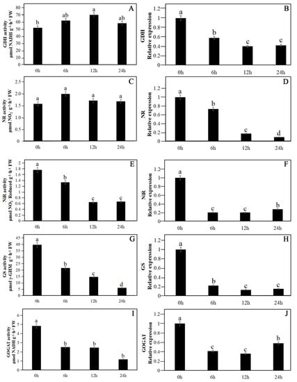 The expression patterns of key genes involved in nitrogen metabolism in a high CO2 environment is shown in Figure 2. Among them, the expression of NR continued to decrease, reaching the lowest value at 24 h, and there was a significant difference between the expression levels corresponding to each treatment time node (Figure 2D). The expression trends of GDH and GS were similar. Their expression levels no longer changed significantly after 12 h of stress treatment (Figure 2B,H). Interestingly, the expression levels of NiR and GOGAT decreased first, and there were no differences at 6 h and 12 h. However, after 24 h, the expression levels increased again but did not return to the untreated level (0 h). The expression levels at 24 h increased significantly compared with those at 6 h and 12 h (Figure 2F,J). Overall, the expression of all genes showed a downregulated trend with increased treatment time.