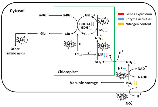 Influence of high CO2 concentration on nitrogen metabolism regulation in Masson pine needles. Biosynthesis pathways according to Taiz [56]. The green and black rectangles represent the chloroplast and cytosol, respectively. The gene expression, enzyme activities and the content of different nitrogen forms are shown in red, blue and orange, respectively. Up- and downward-facing arrows indicate up- and downregulated expression, respectively. The blue line in NR indicates that there is no difference in the enzyme activity expression of NR, and the specific data are shown in Figure 1B. α-KG, α-Ketoglutaric acid; Fdred, Reduced ferredoxin.