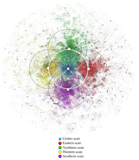 The multiple TLS approach aimed at increasing the number of points whilst simultaneously standardizing their density through a five-scan composition. This was done to estimate whether the difference in acquisition method translates to an increase in the number of identified trees and furthermore in the sample plot reconstruction accuracy. Also, by scanning the same plot from several directions, shadow cones were mostly eliminated.