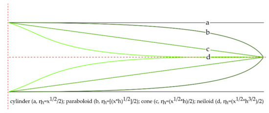 Equation (1) resulted from the initial assumption that a tree trunk can be reduced to a 3D primitive (the simplest geometric object that can represent the stems). But the structure of a stem, with a concave base and a slight convex middle accentuated towards the top, better resembles a neiloid. By not considering this taper, cylindrical representations would generate unrealistically large volumes and tolerances; a paraboloid would be the next best geometry to represent the volume of a stem, with cones midway between the tapered shapes. Neiloids would yield the least excess-volume of all the considered shapes (Figure 3). A theoretical n value would vary between 0 for a cylinder and 3 for a neiloid. However, these values do not lead to realistic results. The literature recommends an n value between 0.9 and 1.5 to best define the real shape of a stem [41].