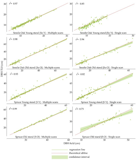 In contrast with the visible DBH underestimation in the single scan results, multiple scans overestimated DBH values in spruce sample plots. It is worth mentioning here, that spruce plots are characterized by an uneven DBH distribution. Only when overlooking the spruce sample plots, can multiple scans approach be considered to have a regulating effect on diameter values, eliminating over- or under-estimation tendencies (Table 4). Despite the slight under and over-estimation, the diameter values strongly correlated to the field measurements (Figure 5), with r values reaching above 0.9. This relation was reflected in the strength of the determination coefficient, r2 which averaged a value above 0.9. Despite the largely similar results, important differences were observed at some sites between single and multiple scans. For example, for SO 1 the r2 coefficient (with respect to the field measurements) changed from 0.33 to 0.98 from single to multiple scans.