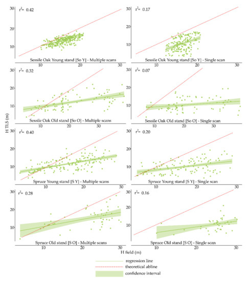 Significantly weaker correlations (Figure 6) were reached in the case of heights estimation (r < 0.76) with determination coefficients of up to 0.59. Switching from single to multiple scans slightly improved the results from r2 of 0.31 for single scans to r2 of 0.41 for multiple scans.