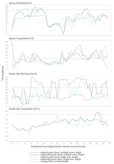 As seen from Table 5, no matter the age, the heights are underestimated (mean underestimation for old sample plots reaches 37% (± 25%) and for young sample plots 14% (± 19%) of the mean real height of the plot) in the sessile oak study area. For spruce areas the mean underestimation is even greater, reaching values of 35% (± 31%) for young trees and 44% (± 27%) for old trees. Both height estimation techniques (segmenting and maximum height per crown projection) lead to unsatisfactory results, suggesting that single wavelength TLS in leaf-on conditions is not suitable for extracting height values at the plot level, because of difficulties in penetrating dense canopies (Figure 8).