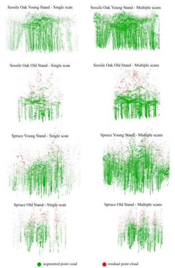 The increase in the number of identified individuals is substantial when switching from a single central scan to a coregistered point cloud. Also, a relationship between the sample plot’s structure (age and species) and segmentation quality was observed, as the number of detected trees increased by 16% for multiple scans in old sample plots and by 29% in young sample plots. By species, multiple scans detected on average 25% more trees when compared to single scans for sessile oak and only 18% more for norway spruce sample plots.